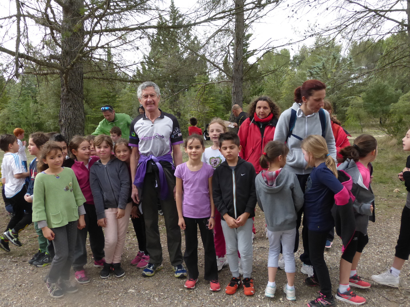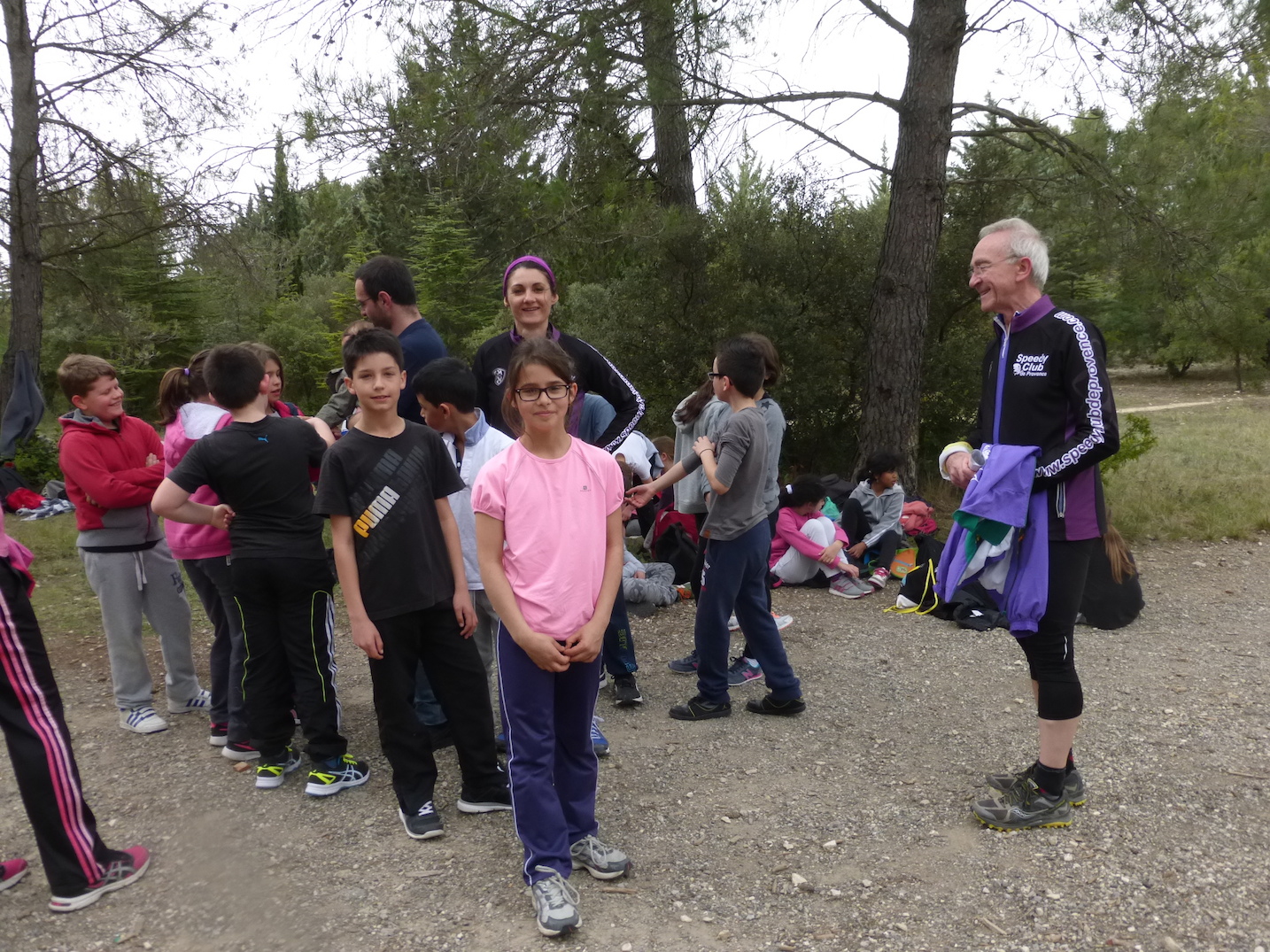 Ma foi, pour 1 école seulement, 3 classes, CE2, CM1, CM2, 84 élèves, notre nombre ajouté aux enseignants et quelques parents, serait suffisant pour une manifestation qui virait à la sortie de classe sportive pourrait on dire. A 10h 30 environ après une préparation d’organisation au pied levé et quelques conseils aux jeunes compétiteurs, le footing de reconnaissance des parcours et aussi d’échauffement a débuté, CM2 en premier puis CM1 puis CE2. Précaution nécessaire car dans ce contexte les parcours n’avaient pu être balisés ni sécurisés des racines et autre pierres saillantes et potentiellement dangereuses par l’habituel marquage à la peinture et il n’y avait personne pour veiller à cette sécurité le long des parcours.