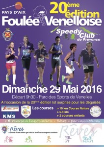 - A la CPA, à Venelles, la 20ème de notre Foulée Venelloise, ses deux parcours nature 60% le 5,8km 110D+ et 70% le 10km 185D+ en collines boisées. Et pour cette spéciale la nouveauté: 2 courses enfants, gratuites, ainsi qu’un encouragement à courir déguisé: lot surprise. Vous serez reçus en toute convivialité: parkings, café avant la course, Buffet d’arrivée copieux et apéritif de clôture, dotations et nombreux lots, soins ostéopathies, photographes pour fixer les instantanés de votre course.