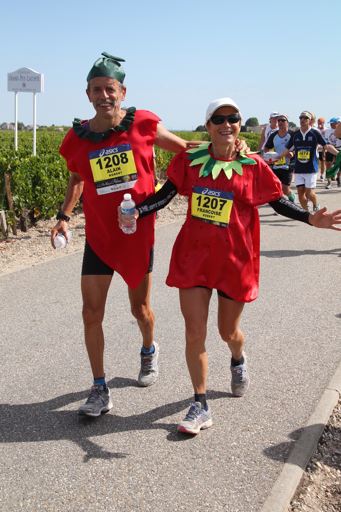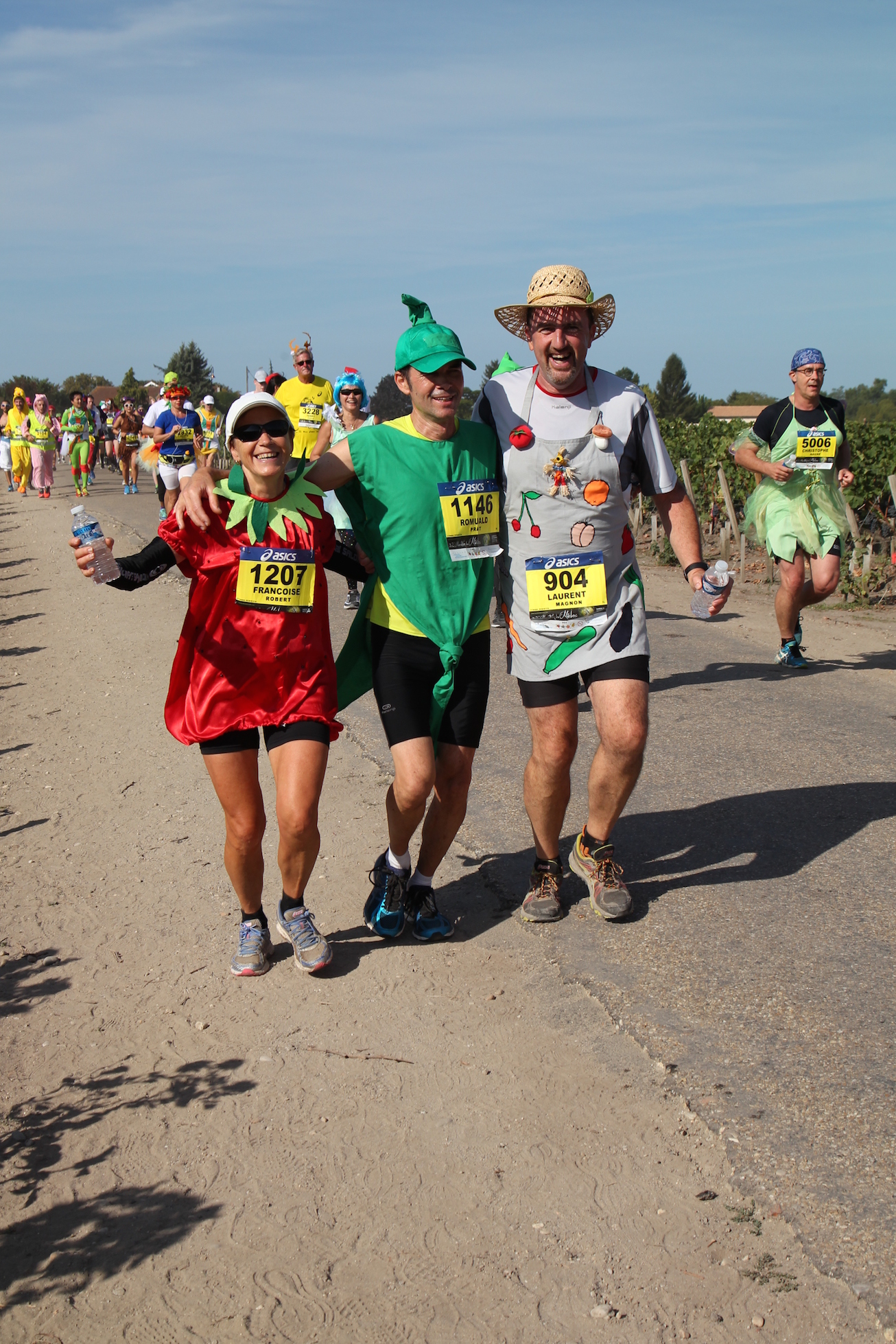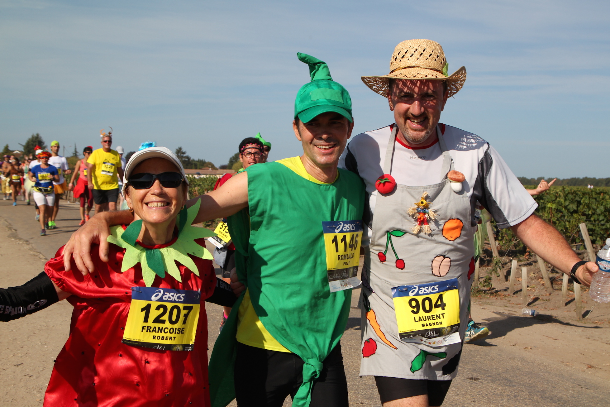 et grand salut à nos légumes, (c’est pas une insulte, que l’on se rassure) qui sont allés faire un grand tour en Médoc pour le 10 septembre. Ils furent autant à l’arrivé qu’au départ! pas le moindre déchet, on pourra dire qu’ils ont eu assez de jus pour terminer! Et ce ne fut pas facile car on le sait ce marathon est un véritable guet-à-pens pour les fruits et légumes mille fois tentés de se fondre dans la verdure des vignes ou de s’attarder avec les fruits de la treille, jus et breuvages tanniques insidieusement placés parmi d’autres gourmandises épicuriennes en des lieux dits de ravitaillement. Oui il leur aura fallu résister. Heureusement, bien encadrés par Laulau, le jardiner du jour qui les a bien coachés ils ont franchi la ligne d’arrivée comme frais arrivés du marché.